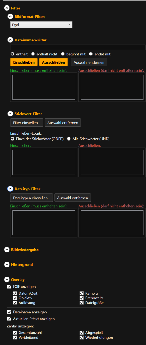 - Schnell & ressourcenschonend: Nach einem einmaligen Scan Ihrer Ordner in eine interne Datenbank startet jede Diashow sofort und ohne Wartezeiten. Kein ständiges „Ordner neu einlesen“. Sobald die ersten Bilder in der Datenbank geladen sind, kann die Diashow gestartet werden.